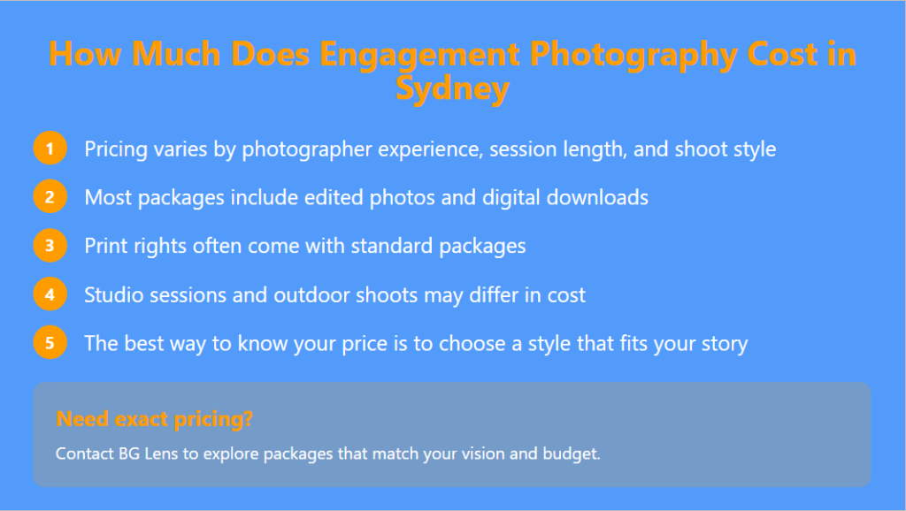 Engagement photography pricing in Sydney can vary depending on the photographer’s experience, session length, and the style of your shoot. Most packages include professionally edited images, high-quality digital downloads, and print release options, so you can treasure your memories in multiple ways.